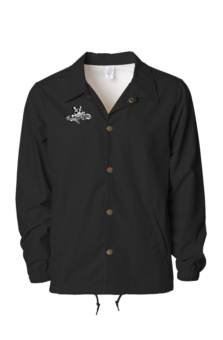 - This coaches jacket features an antique brass 6 snap front closure to help protect you from the wind